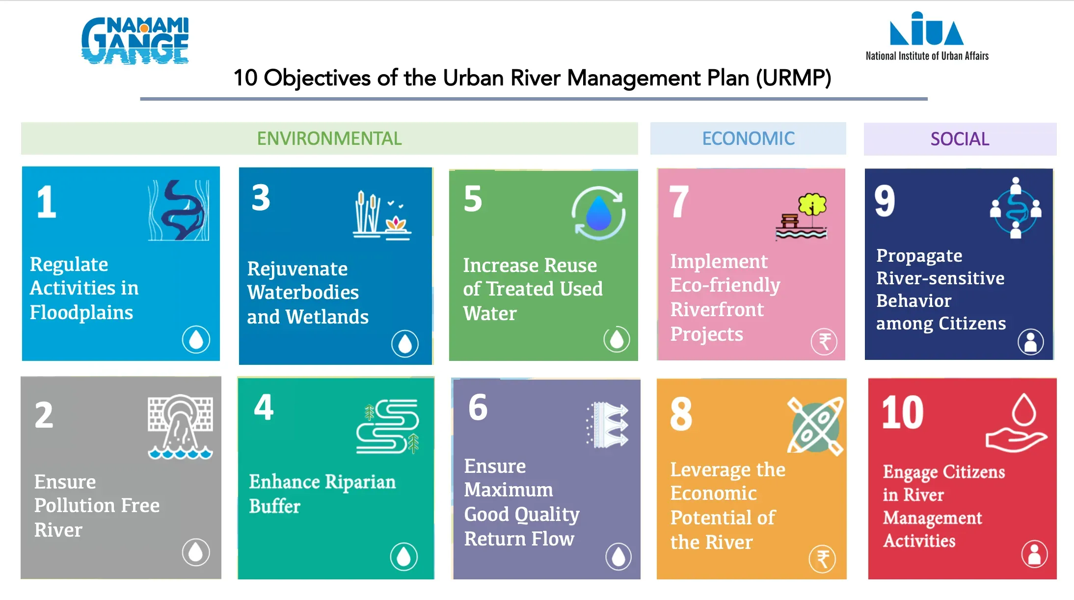 The framework is a general template for river cities to prepare their city-specific river management plans. It was launched on 04 November 2020 by the Hon’ble Minister of Jal Shakti. It comprises a 10-point agenda that cities need to act on.